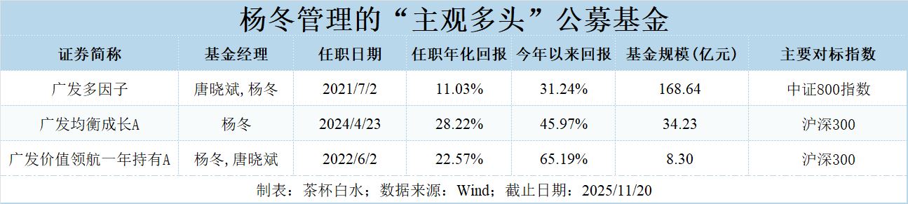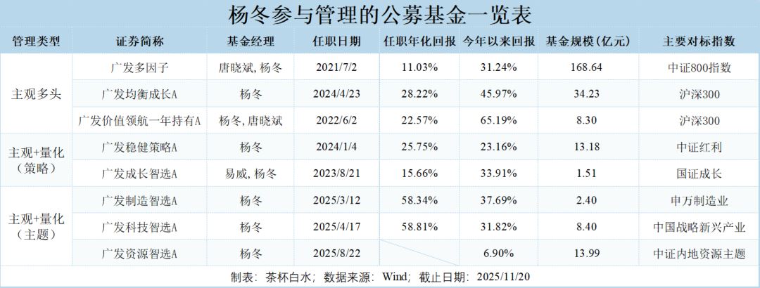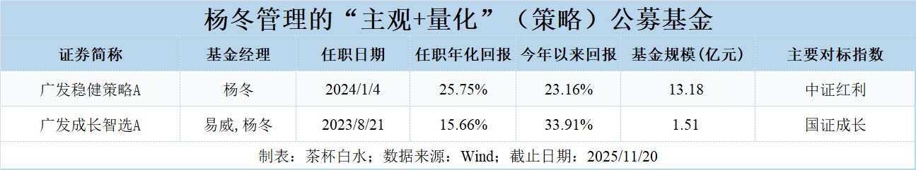 具体来看,杨冬管理的策略类产品包括广发稳健策略(006780)和广发成长智选(002802),业绩基准分别主要对标中证红利和国证1000成长指数。