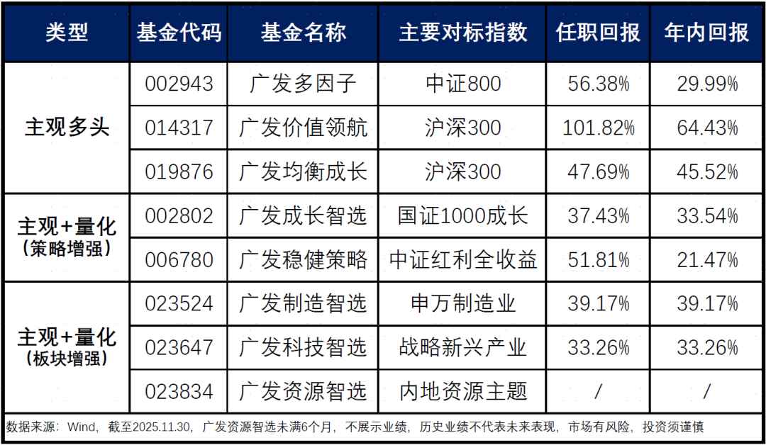 除了广发多因子,团队旗下的底仓型产品还有广发价值领航一年(014317)与广发均衡成长(019876),这两只产品自成立以来的累计收益分别达到101.82%和47.69%,年化收益率均达到20%以上(数据来源:Wind,截至2025.11.30)。