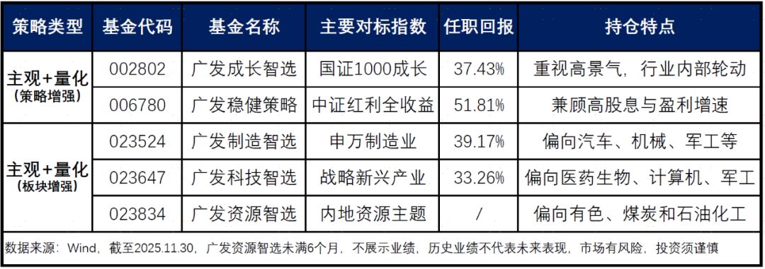 广发资源智选(023834)、广发科技智选(023647)、广发制造智选(023524)均为2025年内新发的主题增强型产品,均采用“主观多头+主动量化+AI增强”的复合策略。