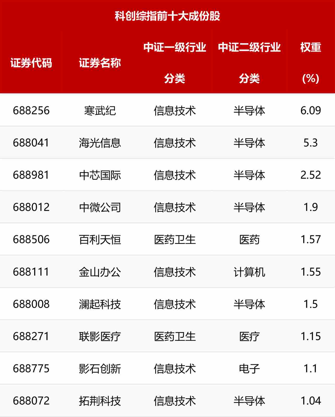 在行业与成分股结构上,指数科创浓度高,覆盖超过500只成分股,包含大、中、小盘,采用总市值加权,堪称“科创板500强”的集中代表,为投资者提供了一键配置科创板企业的便捷工具;其前十大成分股权重合计为23.59%,集中度相对较低。