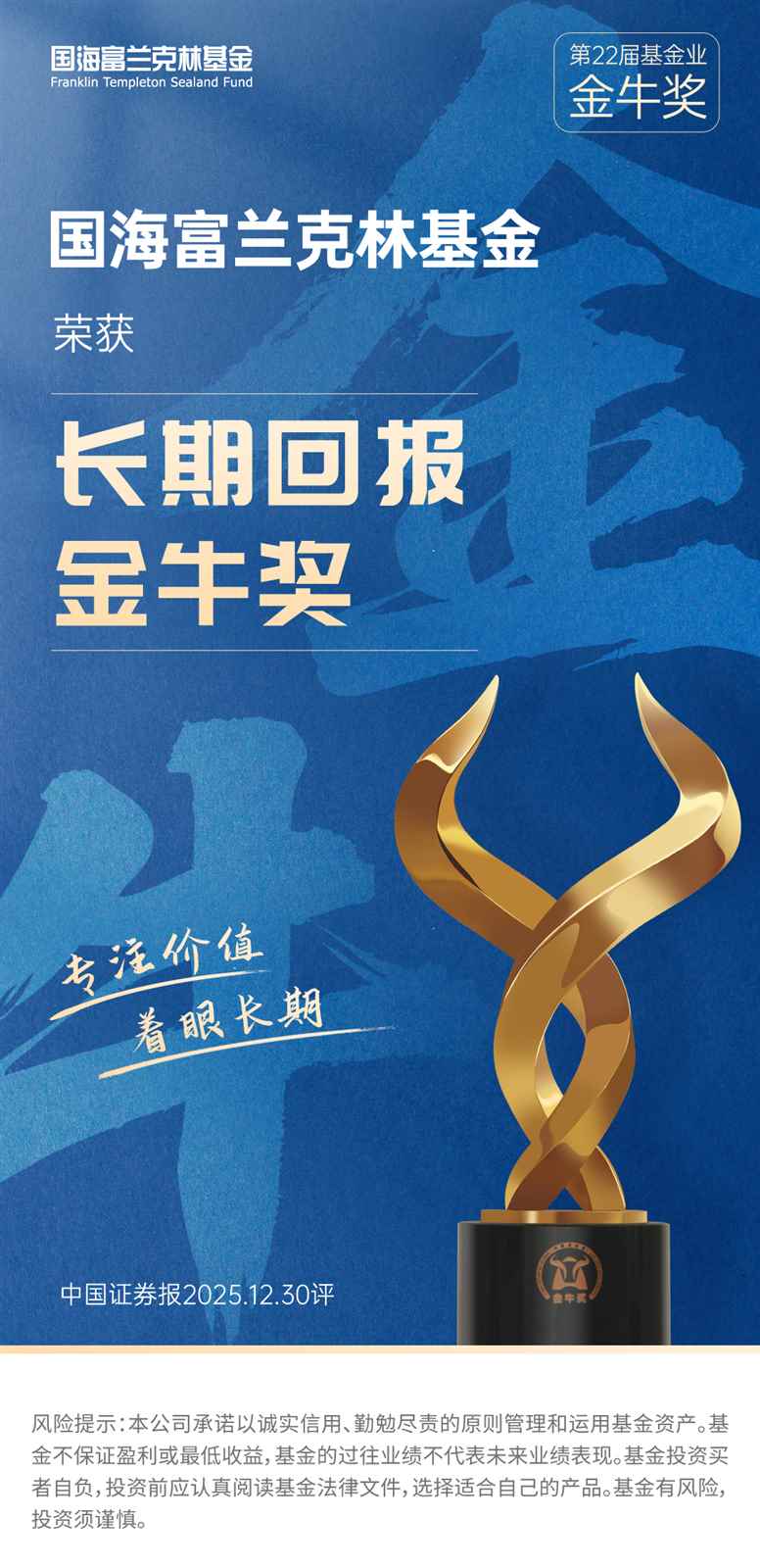 12月30日,由《中国证券报》主办的“2025公募基金高质量发展大会”在上海举行,同步揭晓第二十二届基金业金牛奖评选结果。国海富兰克林基金管理有限公司凭借长期稳健的经营管理,领先的投资管理实力,与注重基民获得感的使命担当,荣获“主动权益投资金牛基金公司奖”、“长期回报金牛奖”两项重磅大奖。