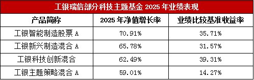 根据基金2025年四季报,工银智能制造股票A、工银新兴制造混合A、工银科技创新混合、工银主题策略混合A近一年收益率均超50%,分别为70.91%、65.78%、62.49%、59.01%,表现显著超越各自的业绩比较基准。