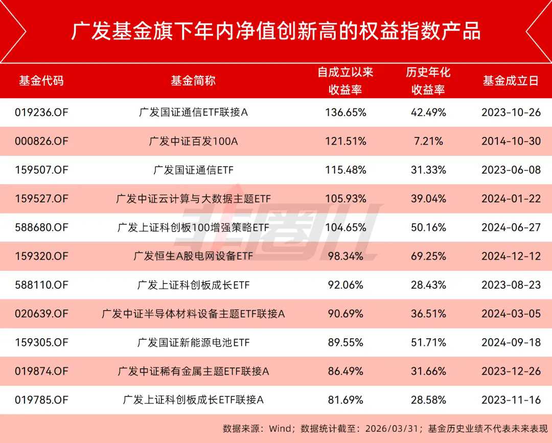 比如广发制造业精选A,成立以来收益率596.74%,历史年化收益率14.28%;广发多因子A,成立以来收益率437.46%,历史年化收益率19.92%;广发电子信息传媒股票A,成立以来收益率254.87%,历史年化收益率16.47%。(数据来源:Wind、基金定期报告,截至2026.3.31)