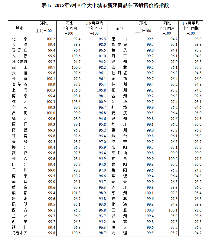 2025年9月份,70个大中城市中,各线城市商品住宅销售价格环比下降,同比降幅继续呈收窄态势。