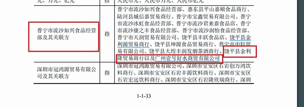 由于第一大客户涉及到普宁市流沙如兴食品经营部的关联方,因此在招股书中,公司对其相关关联方客户进行了披露“注释”。普宁市流沙如兴食品经营部的相关关联方为:惠东县平山嘉顺食品商行、 陆河县城信嘉贸易商行、普宁市宝鑫贸易有限公司、普宁市流沙冰虹食品经营部、普宁市流沙君来嘉食品店、普宁市流沙康之丰食品经营部、普宁市流沙润怡食品经营部、 普宁市天润贸易有限公司、饶平县丰跃食品店、饶平县金利源贸易商行、饶平县坤源食品贸易商行、普宁市中轩贸易有限公司、饶平县大埕丰润发烟茶酒商行、饶平县金利隆贸易商行以及广州壹号好水商贸有限公司。