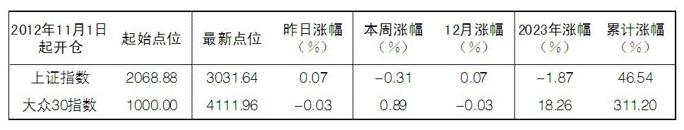 本报讯(记者 汤晓飞)本周,大盘呈现探底后逐步企稳的走势,上证综指下跌0.31%,深证成指下跌1.21%,大众30指数上涨0.89%。