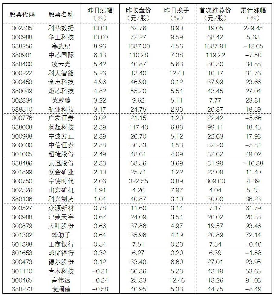 大众30指数成份股中,11日涨幅前五位的分别是科华数据、华工科技、寒武纪、中建国际、凌云光,涨幅分别为10.01%、10.00%、8.96%、6.13%、5.42%;跌幅榜上,麦澜德、高伟达、青木科技跌幅居前。