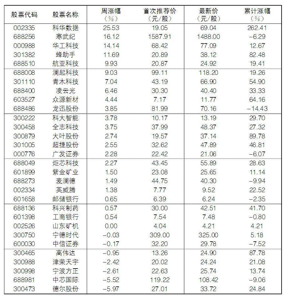 大众30指数成份股中,本周涨幅前五位的分别是科华数据、寒武纪、华工科技、蜂助手、航亚科技,涨幅分别为25.53%、16.12%、14.14%、11.69%、9.93%;跌幅榜上,德尔股份、中芯国际、宁波方正、津荣天宇等跌幅居前。