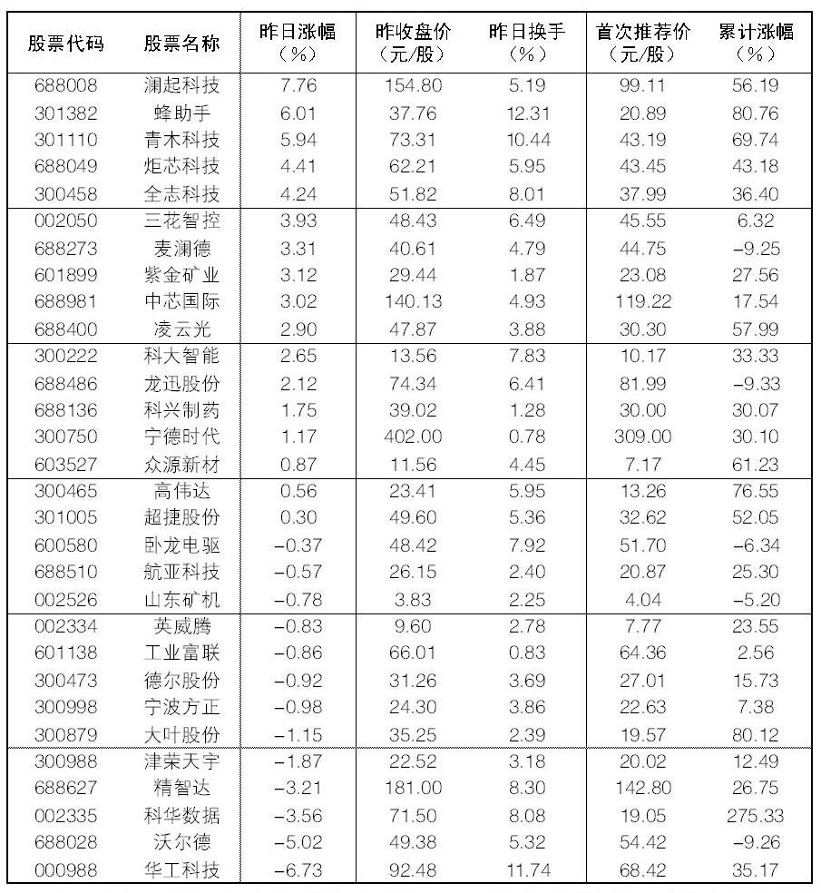 大众30指数成份股中,30日涨幅前五位的分别是澜起科技、蜂助手、青木科技、炬芯科技、全志科技,涨幅分别为7.76%、6.01%、5.94%、4.41%、4.24%;跌幅榜上,华工科技、沃尔德、科华数据、精智达等跌幅居前。
