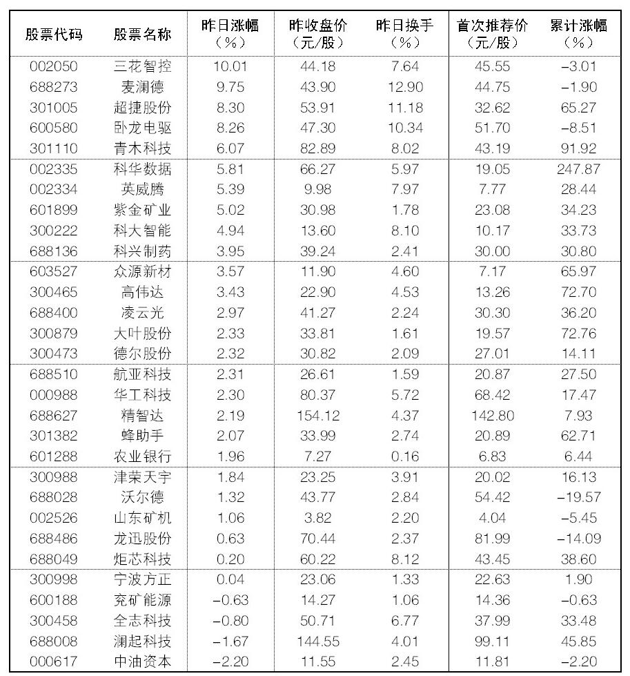 大众30指数成份股中,15日涨幅前五位的分别是三花智控、麦澜德、超捷股份、卧龙电驱、青木科技,涨幅分别为10.01%、9.75%、8.30%、8.26%、6.07%;跌幅榜上,中油资本、澜起科技、全志科技等跌幅居前。