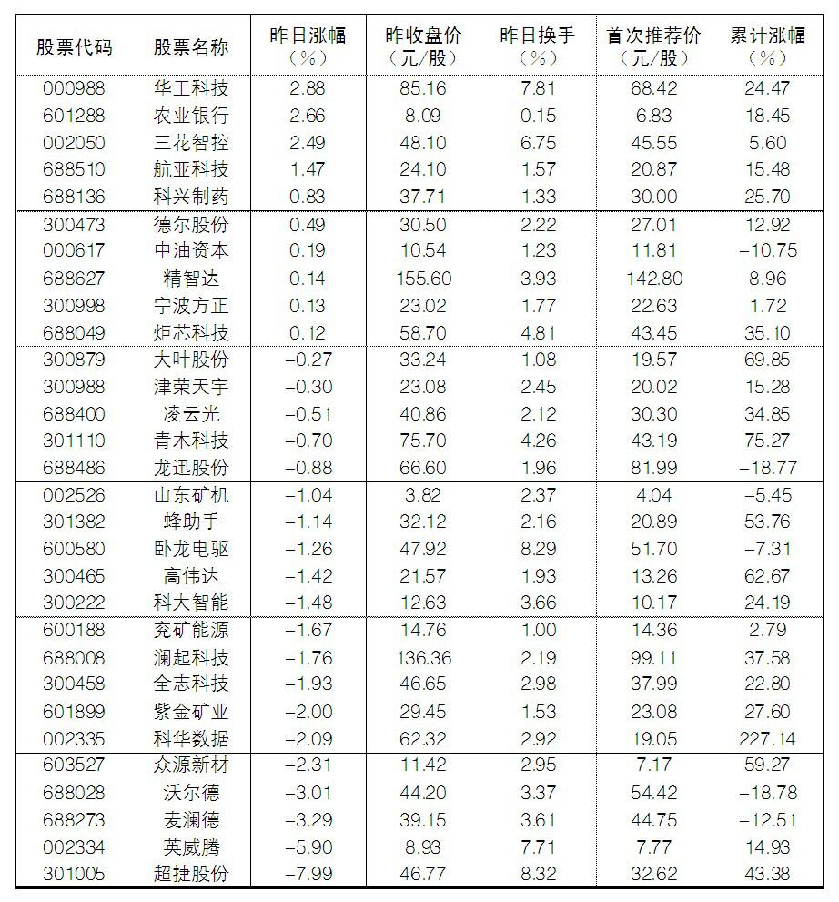 大众30指数成份股中,22日涨幅前五位的分别是华工科技、农业银行、三花智控、航亚科技、科兴制药,涨幅分别为2.88%、2.66%、2.49%、1.47%、0.83%;跌幅榜上,超捷股份、英威腾、麦澜德、沃尔德等跌幅居前。