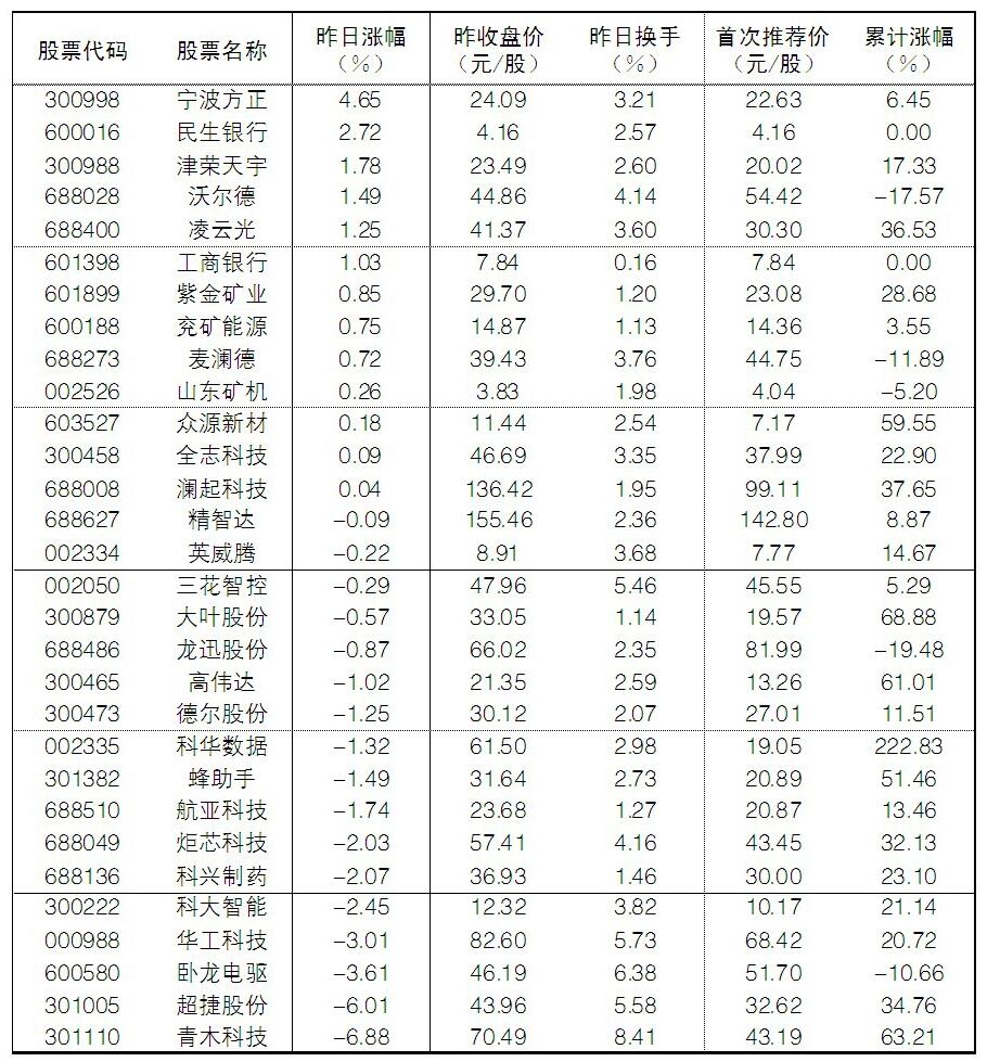 大众30指数成份股中,23日涨幅前五位的分别是宁波方正、津荣天宇、沃尔德、凌云光、紫金矿业,涨幅分别为4.65%、1.78%、1.49%、1.25%、0.85%;跌幅榜上,青木科技、超捷股份、卧龙电驱、华工科技等跌幅居前。