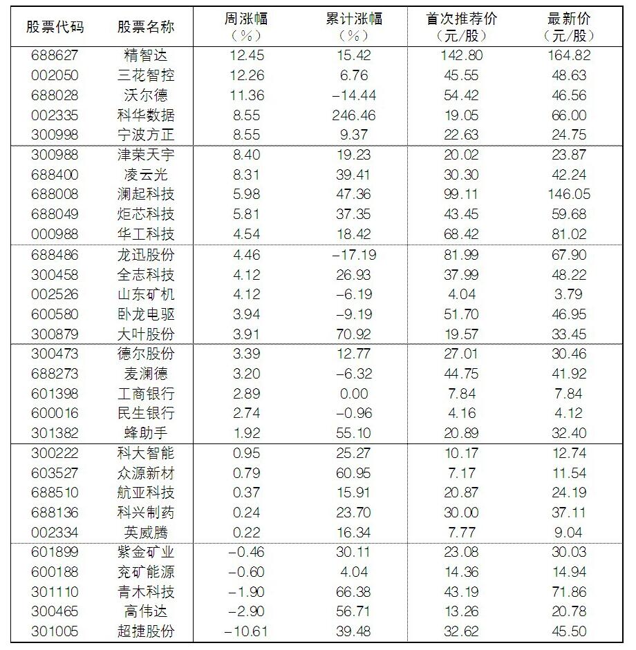 大众30指数成份股中,本周涨幅前五位的分别是精智达、三花智控、沃尔德、宁波方正、科华数据,涨幅分别为12.45%、12.26%、11.36%、8.55%和8.55%;跌幅榜上,超捷股份、高伟达、青木科技等跌幅居前。