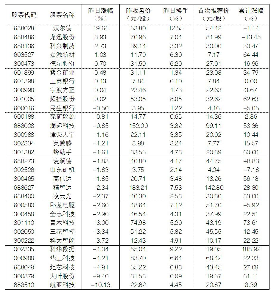 大众30指数成份股中,30日涨幅前五位的分别是沃尔德、龙迅股份、科兴制药、众源新材、德尔股份,涨幅分别为19.64%、3.93%、2.73%、1.03%、0.70%;跌幅榜上,航亚科技、大叶股份、炬芯科技、华工科技等跌幅居前。