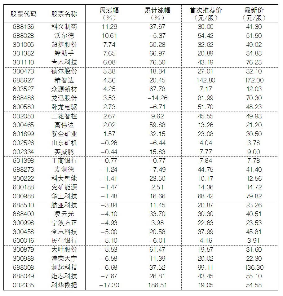 大众30指数成份股中,本周涨幅前五位的分别是科兴制药、沃尔德、超捷股份、蜂助手、青木科技,涨幅分别为11.29%、10.61%、7.74%、7.65%和6.08%;跌幅榜上,科华数据、炬芯科技、澜起科技、津荣天宇等跌幅居前。