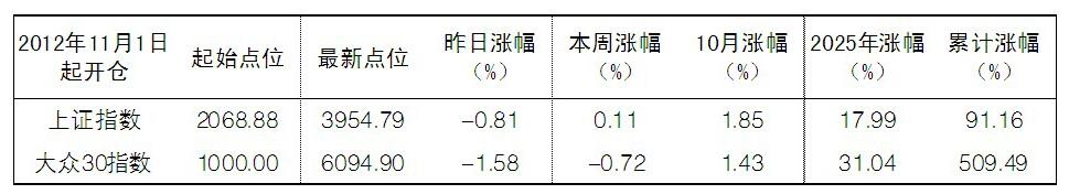本报综合消息 本周,大盘呈现冲高回落的走势。上证综指上涨0.11%,深证成指上涨0.67%,创业板指上涨0.50%,大众30指数下跌0.72%。