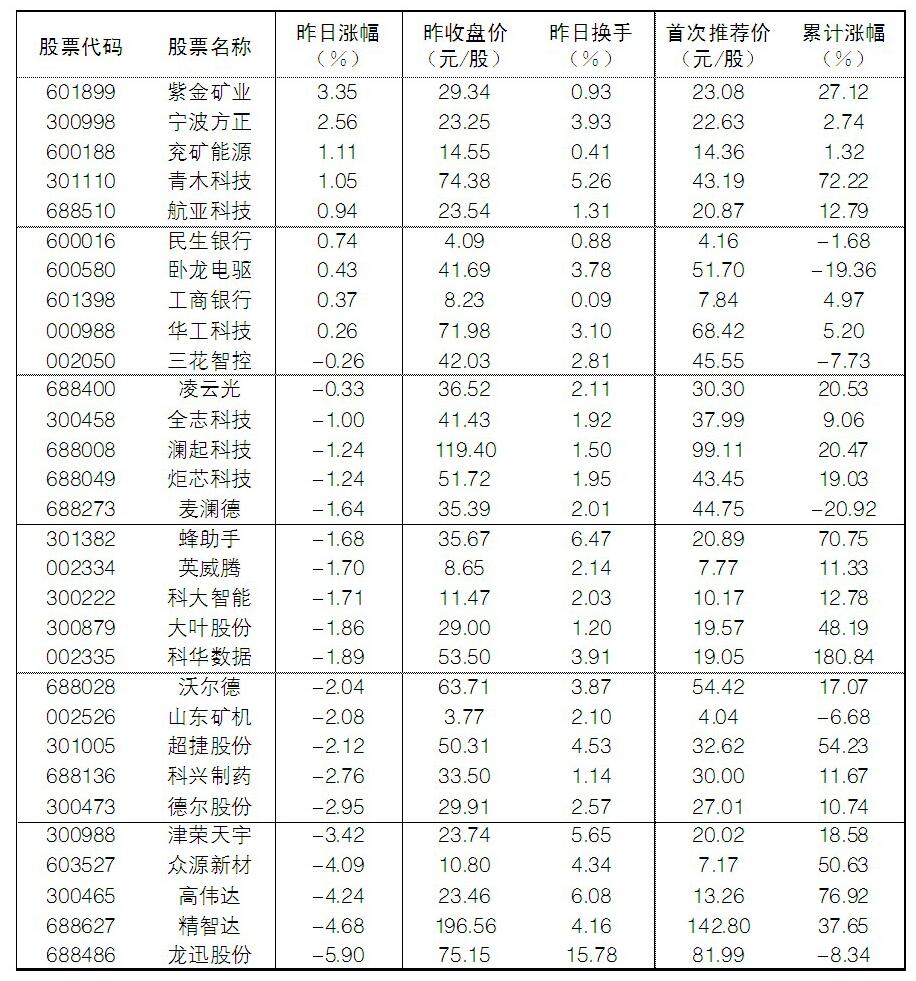 大众30指数成份股中,19日涨幅前五位的分别是紫金矿业、宁波方正、兖矿能源、青木科技、航亚科技,涨幅分别为3.35%、2.56%、1.11%、1.05%、0.94%;跌幅榜上,龙迅股份、精智达、高伟达、众源新材等跌幅居前。