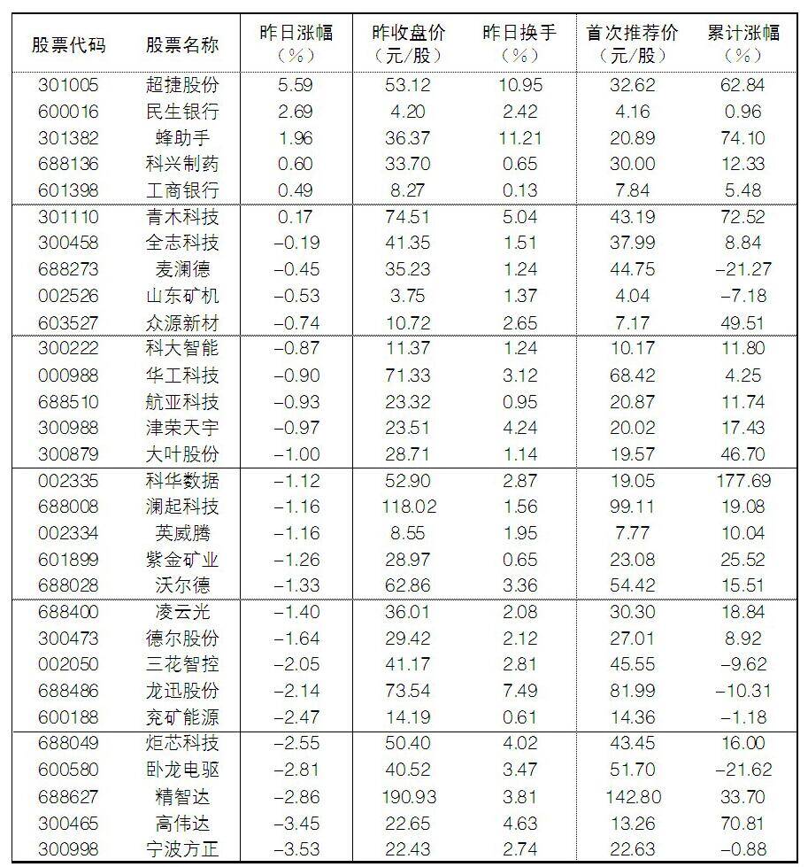 大众30指数成份股中,20日涨幅前五位的分别是超捷股份、民生银行、蜂助手、科兴制药、工商银行,涨幅分别为5.59%、2.69%、1.96%、0.60%和0.49%;跌幅榜上,宁波方正、高伟达、精智达、卧龙电驱等跌幅居前。