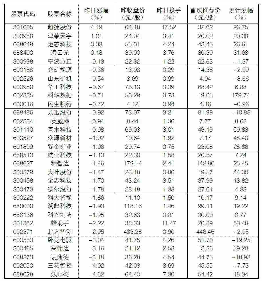 大众30指数成份股中,2日逆市上涨的是超捷股份、津荣天宇、炬芯科技、凌云光,涨幅分别为4.19%、1.01%、0.33%、0.18%;跌幅榜上,沃尔德、三花智控、麦澜德、高伟达等跌幅居前。