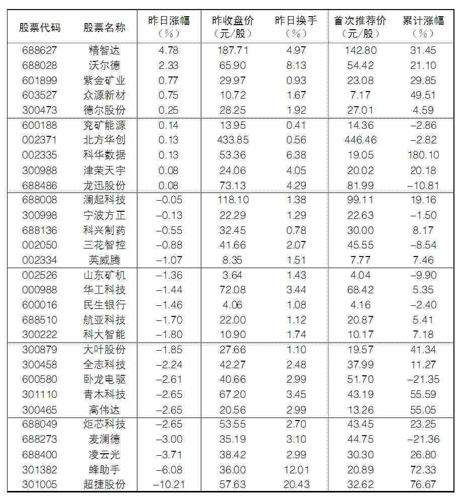 大众30指数成份股中,3日涨幅前五位的分别是精智达、沃尔德、紫金矿业、众源新材、德尔股份,涨幅分别为4.78%、2.33%、0.77%、0.75%和0.25%;跌幅榜上,超捷股份、蜂助手、凌云光、麦澜德等跌幅居前。