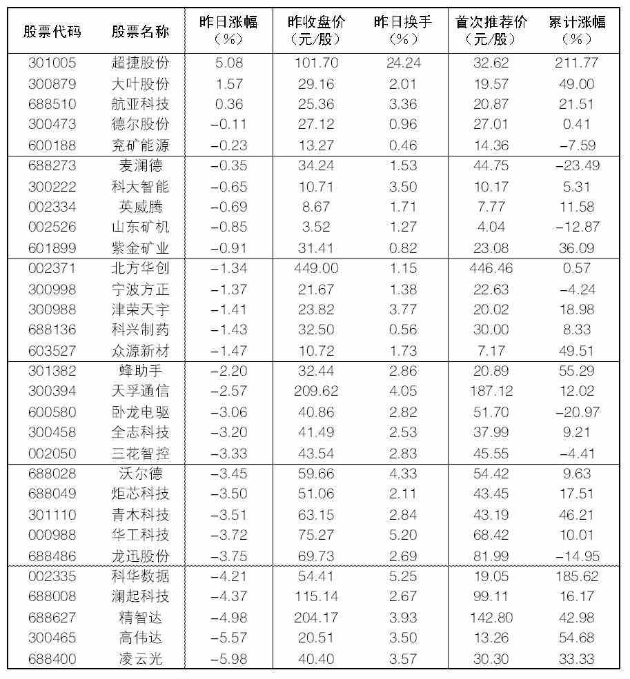 大众30指数成份股中,15日逆市上涨的是超捷股份、大叶股份、航亚科技,涨幅分别为5.08%、1.57%和0.36%;跌幅榜上,凌云光、高伟达、精智达、澜起科技、科华数据等跌幅居前。