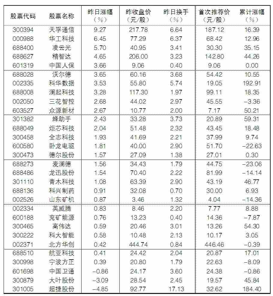 大众30指数成份股中,17日涨幅前五位的分别是天孚通信、华工科技、凌云光、精智达、沃尔德,涨幅分别为9.27%、6.45%、5.70%、4.65%和3.65%;跌幅榜上,超捷股份、大叶股份、中国卫通跌幅居前。
