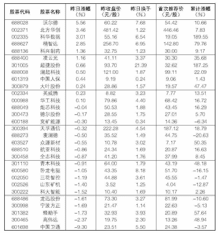 大众30指数成份股中,23日涨幅前五位的分别是沃尔德、北方华创、科华数据、精智达、科兴制药,涨幅分别为5.56%、3.46%、3.01%、2.85%、1.36%;跌幅榜上,中国卫通、高伟达、蜂助手、宁波方正等跌幅居前。