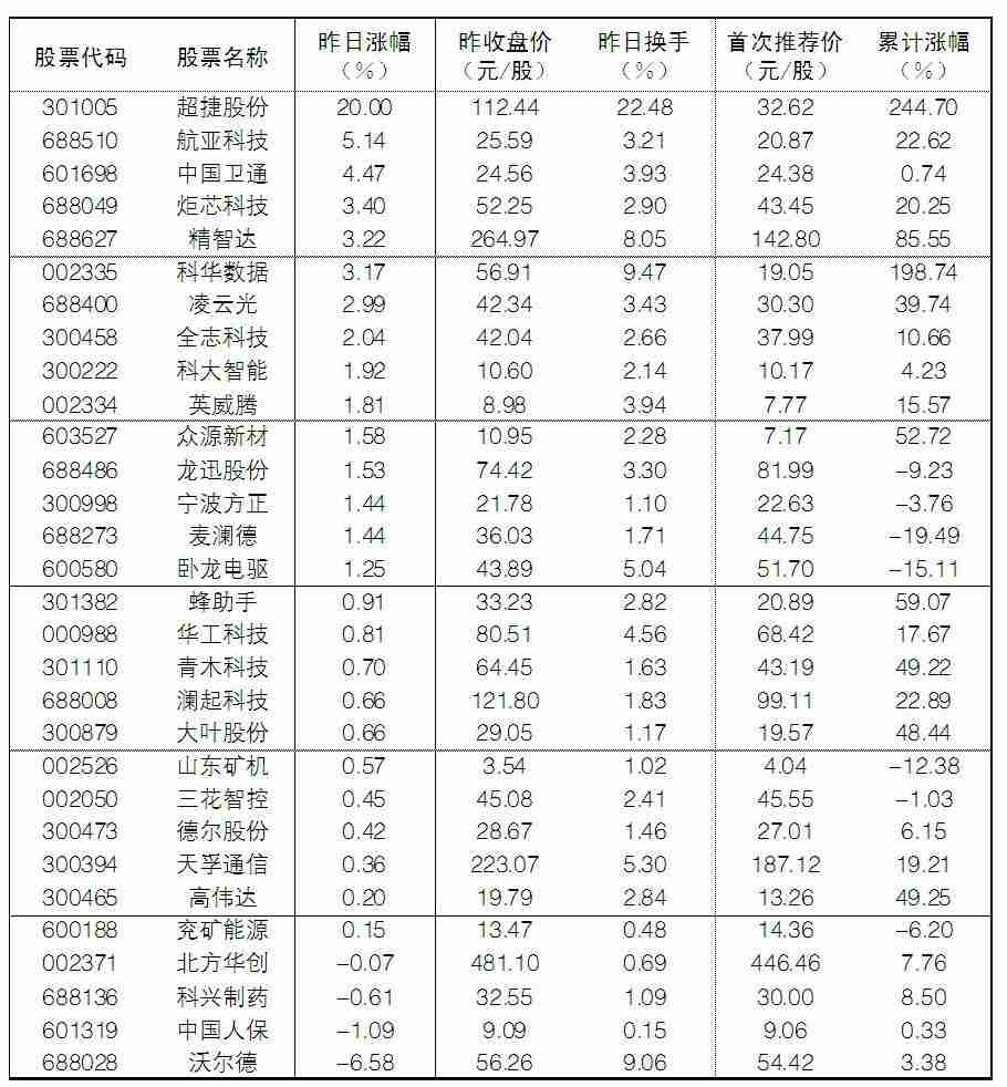 大众30指数成份股中,24日涨幅前五位的分别是超捷股份、航亚科技、中国卫通、炬芯科技、精智达,涨幅分别为20.00%、5.14%、4.47%、3.40%和3.22%;跌幅榜上,沃尔德、中国人保、科兴制药、北方华创等跌幅居前。