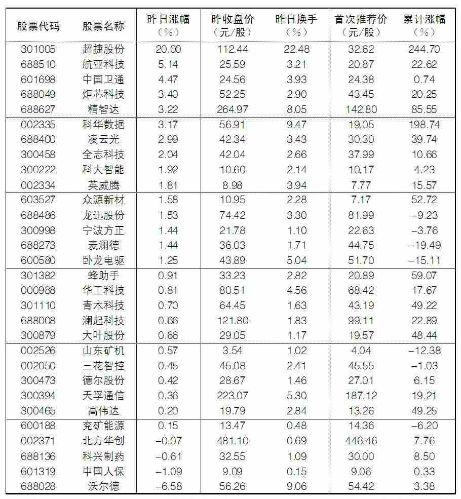 大众30指数成份股中,25日涨幅前五位的分别是超捷股份、麦澜德、航亚科技、三花智控、炬芯科技,涨幅分别为20.00%、12.07%、5.90%、5.50%、5.30%;跌幅榜上,精智达、天孚通信、北方华创、兖矿能源等跌幅居前。
