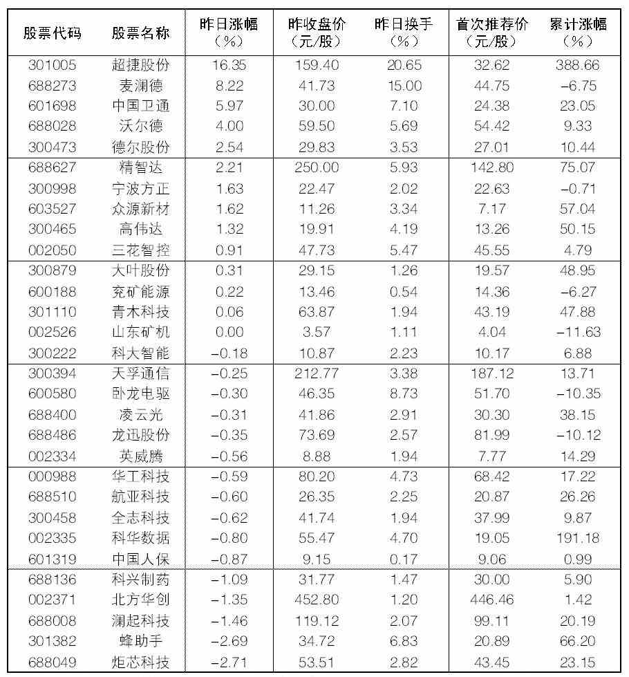 大众30指数成份股中,29日涨幅前五位的分别是超捷股份、麦澜德、中国卫通、沃尔德、德尔股份,涨幅分别为16.35%、8.22%、5.97%、4.00%和2.54%;跌幅榜上,炬芯科技、蜂助手、澜起科技、北方华创等跌幅居前。
