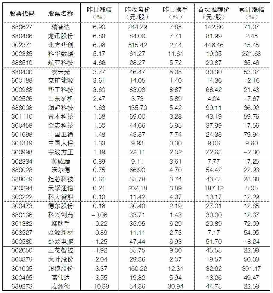 大众30指数成份股中,7日涨幅前五位的分别是精智达、龙迅股份、北方华创、科华数据、航亚科技,涨幅分别为6.90%、6.88%、6.06%、5.17%和4.66%;跌幅榜上,麦澜德、高伟达、超捷股份、大叶股份等跌幅居前。