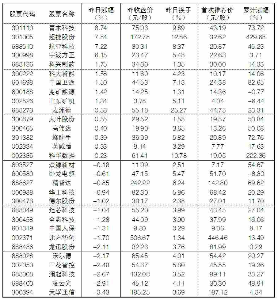 大众30指数成份股中,8日涨幅前五位的分别是青木科技、超捷股份、航亚科技、宁波方正、科兴制药,涨幅分别为8.74%、7.84%、7.22%、6.15%和1.75%;跌幅榜上,天孚通信、凌云光、澜起科技、三花智控等跌幅居前。