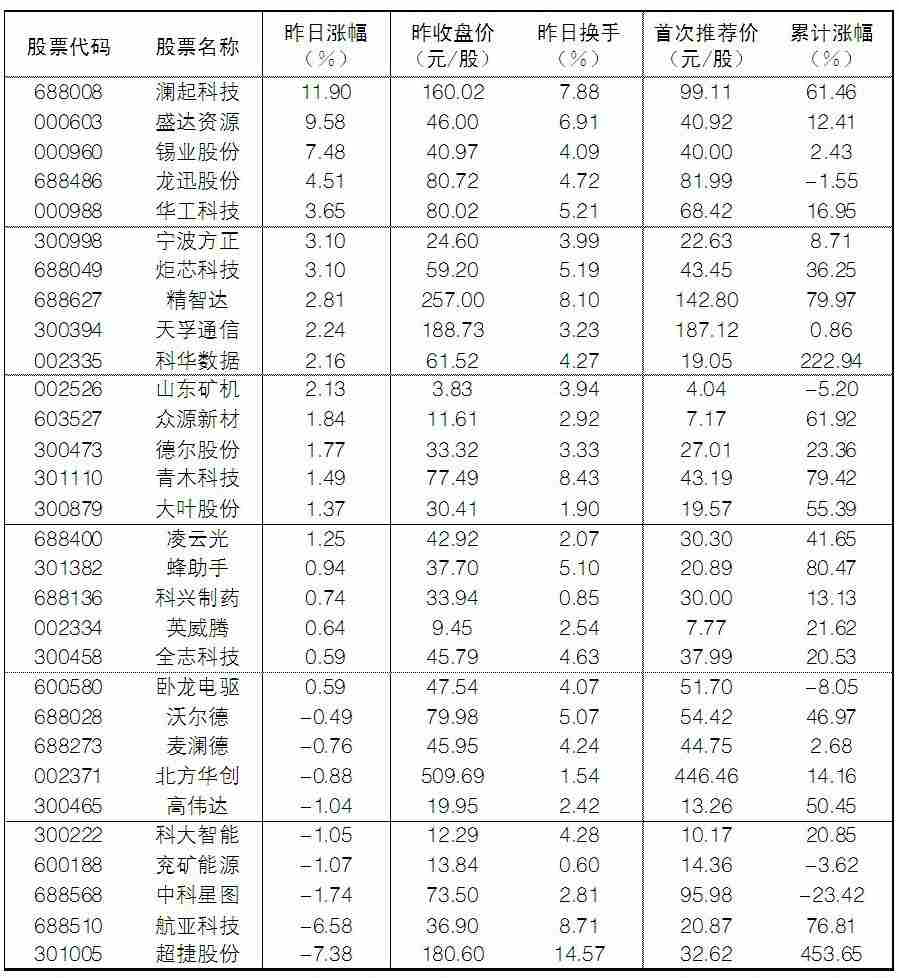 大众30指数成份股中,21日涨幅前五位的分别是澜起科技、盛达资源、锡业股份、龙迅股份、华工科技,涨幅分别为11.90%、9.58%、7.48%、4.51%和3.65%;跌幅榜上,超捷股份、航亚科技、中科星图、兖矿能源等跌幅居前。