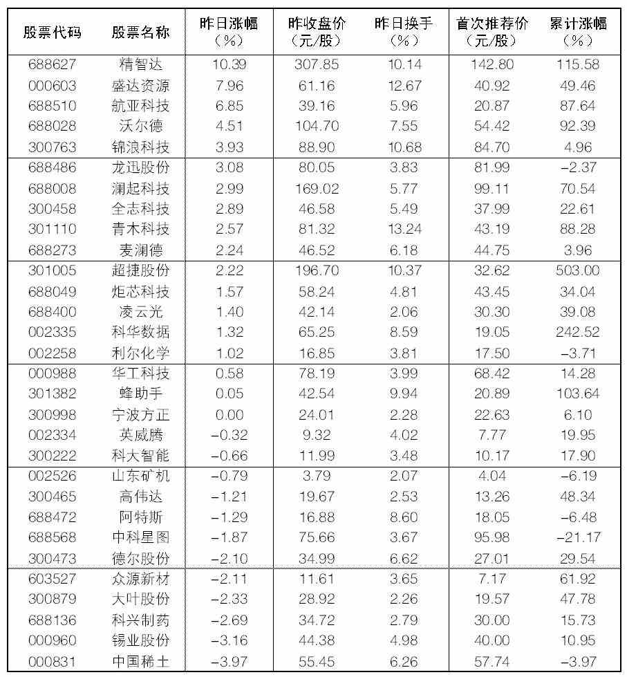 大众30指数成份股中,27日涨幅前五位的分别是精智达、盛达资源、航亚科技、沃尔德、锦浪科技,涨幅分别为10.39%、7.96%、6.85%、4.51%、3.93%;跌幅榜上,中国稀土、锡业股份、科兴制药等跌幅居前。