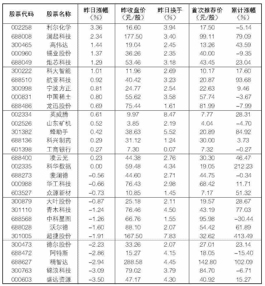 大众30指数成份股中,10日涨幅前五位的分别是利尔化学、澜起科技、高伟达、锡业股份、炬芯科技,涨幅分别为3.36%、2.34%、1.44%、1.37%、1.29%;跌幅榜上,盛达资源、锦浪科技、精智达、阿特斯等跌幅居前。