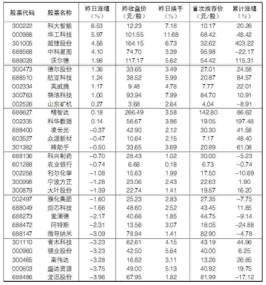 大众30指数成份股中,4日涨幅前五位的分别是科大智能、华工科技、超捷股份、中科星图、沃尔德,涨幅分别为6.53%、5.97%、4.56%、4.10%和1.98%;跌幅榜上,龙迅股份、盛达资源、高伟达、锡业股份等跌幅居前。