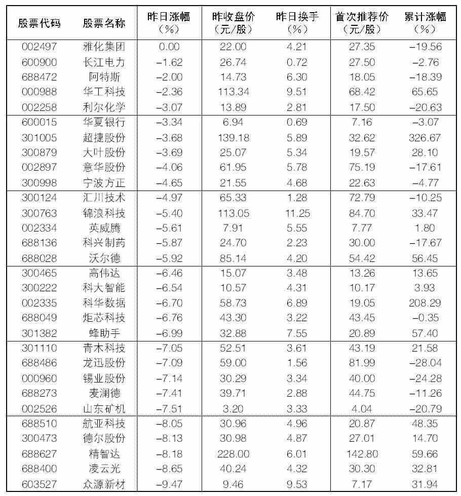 大众30指数成份股中,23日相对抗跌的有雅化集团、长江电力、阿特斯、华工科技、利尔化学;跌幅榜上,众源新材、凌云光、精智达、德尔股份等跌幅居前。