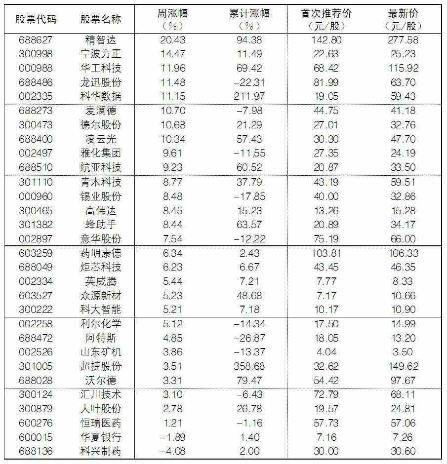 大众30指数成份股中,本周涨幅前五位的分别是精智达、宁波方正、华工科技、龙迅股份、科华数据,涨幅分别为20.43%、14.47%、11.96%、11.48%和11.15%;跌幅榜上,科兴制药、华夏银行等跌幅居前。