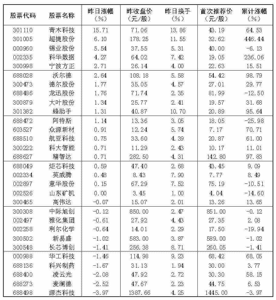 大众30指数成份股中,20日涨幅前五位的分别是青木科技、超捷股份、锡业股份、科华数据、宁波方正,涨幅分别为15.71%、6.10%、5.54%、4.27%和2.71%;跌幅榜上,源杰科技、麦澜德、凌云光、科兴制药等跌幅居前。