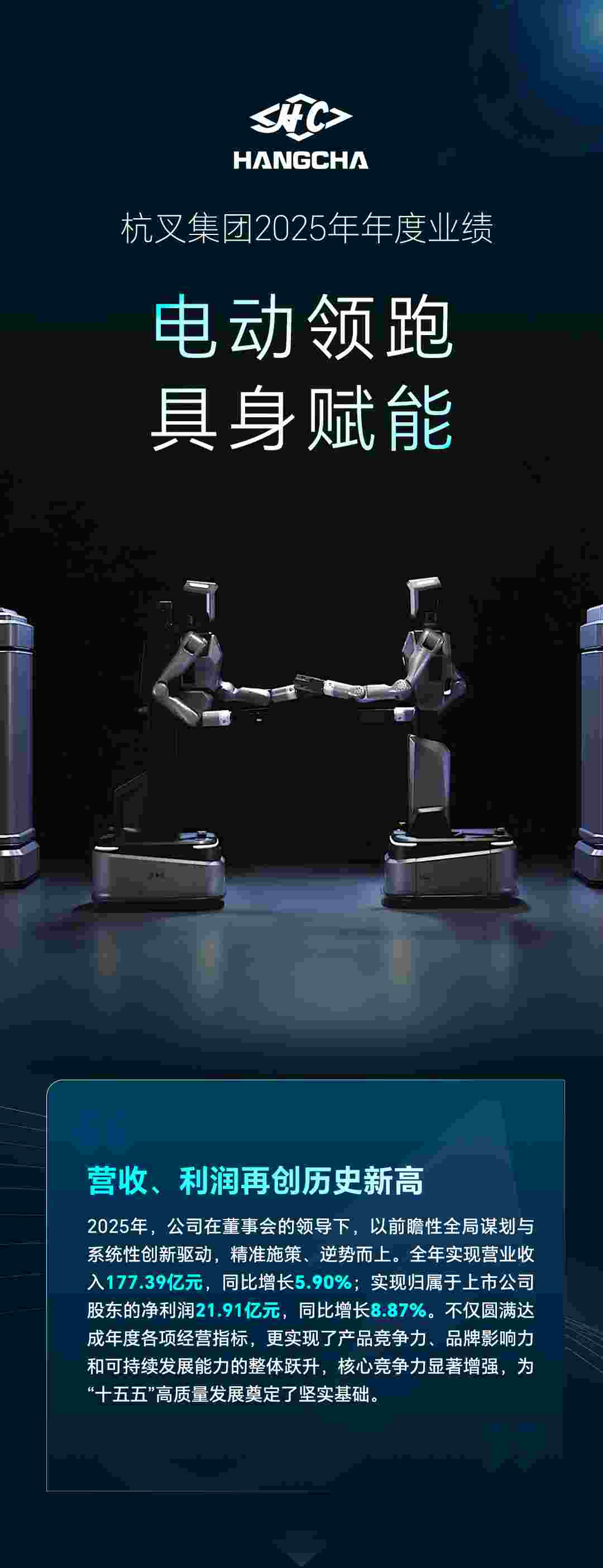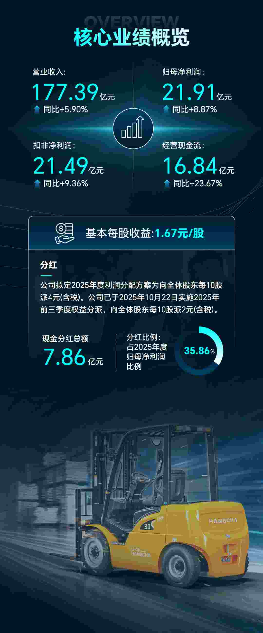 2026年4月21日晚,杭叉集团发布2025年年度报告,报告显示公司实现营业收入177.39亿元,同比增长5.90%;实现归属于上市公司股东的净利润21.91亿元,同比增长8.87%;基本每股收益为1.67元;公司拟向全体股东每10股派发现金红利4元(含税),分红比例占2025年度归母净利润比例35.86%。