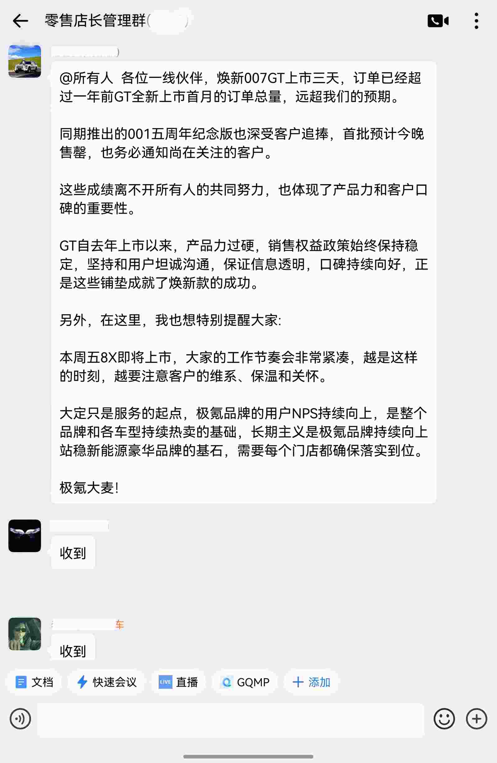 4月13日,知情人士从内部获悉,极氪焕新7系的订单超出预期。内部销售群聊记录显示,上市仅3天,焕新007GT订单已超一年前老款车型上市首月的订单总量。同期推出的极氪001五周年纪念版同样火爆,首批车型预计即将售罄。