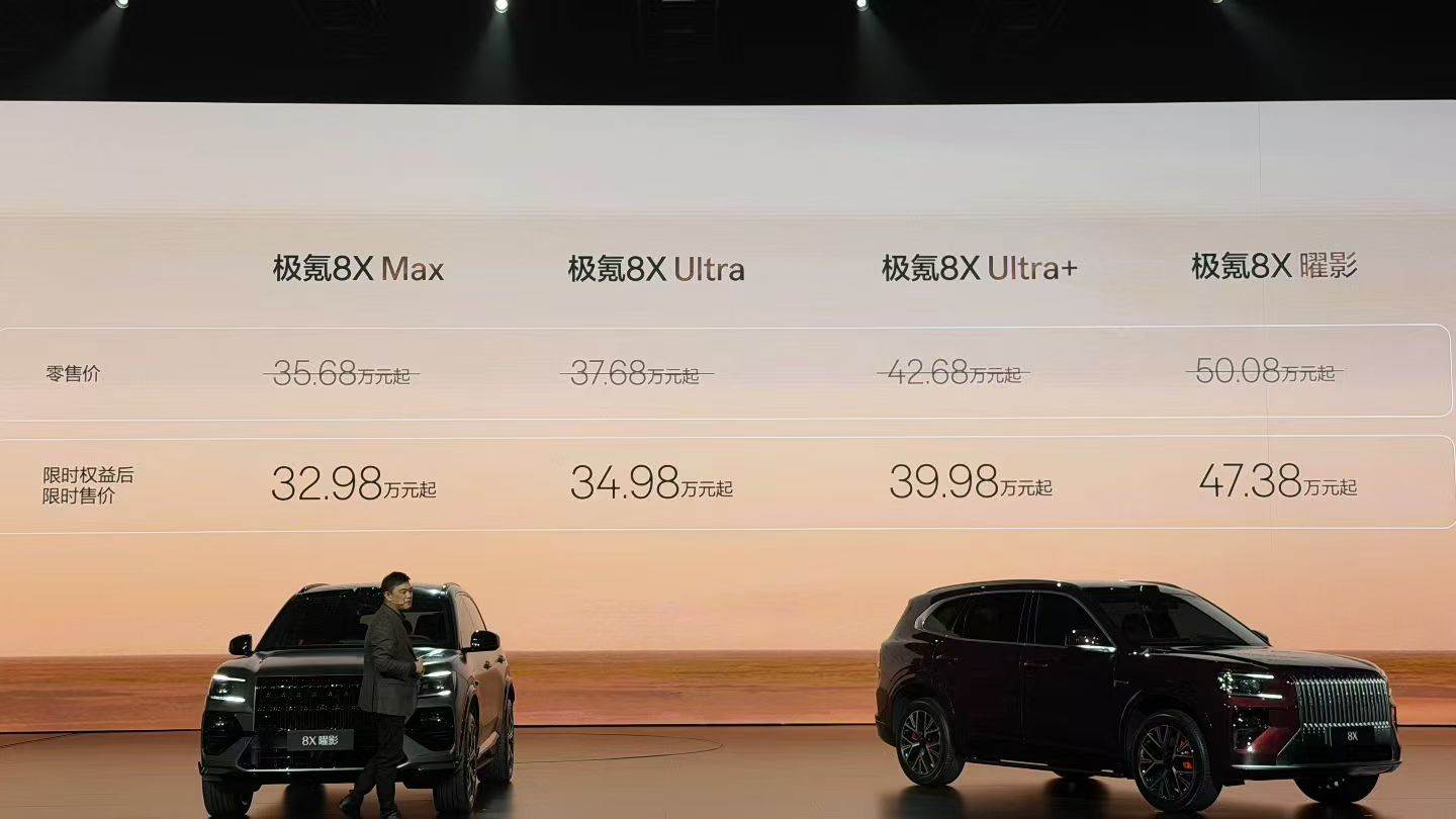 据悉,极氪8X的Max版、Ultra版、Ultra+版零售价区间为35.68万元-42.68万元起,权益后限时售价32.98万元-39.98万元起;8X曜影零售价50.08万元起,权益后限时售价47.38万元起。业内分析认为,极氪8X订单火爆,意味着中国品牌能与BBA高性能旗舰车型正面竞争,打破了传统豪华品牌高性能即高溢价的局面,将改写全球豪华高性能SUV市场格局。