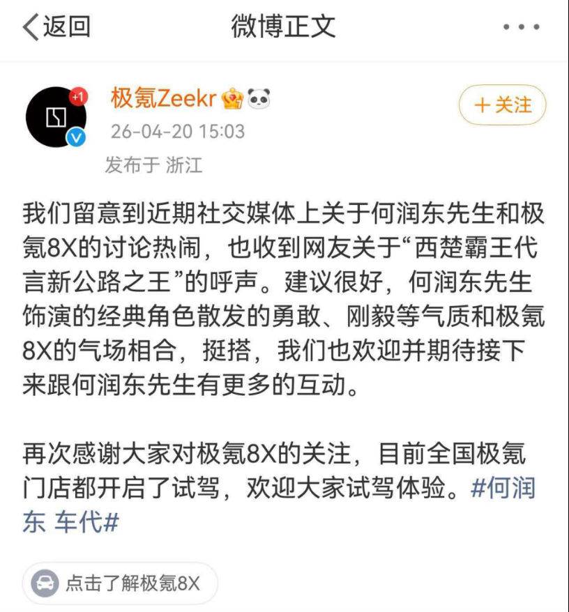 4月20日,“演员何润东现身上海极氪门店”的视频在网络流传,“何润东 车代”话题随即登上微博热搜。针对网友“让西楚霸王给新公路之王极氪8X代言”的呼声,极氪官方当天下午在社交平台上发文回应称:建议很好。