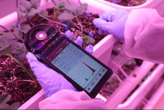 ▲ 欧普智莓团队成员在植物工厂内,利用植物光照分析仪采集关键数据。陆云波|摄
