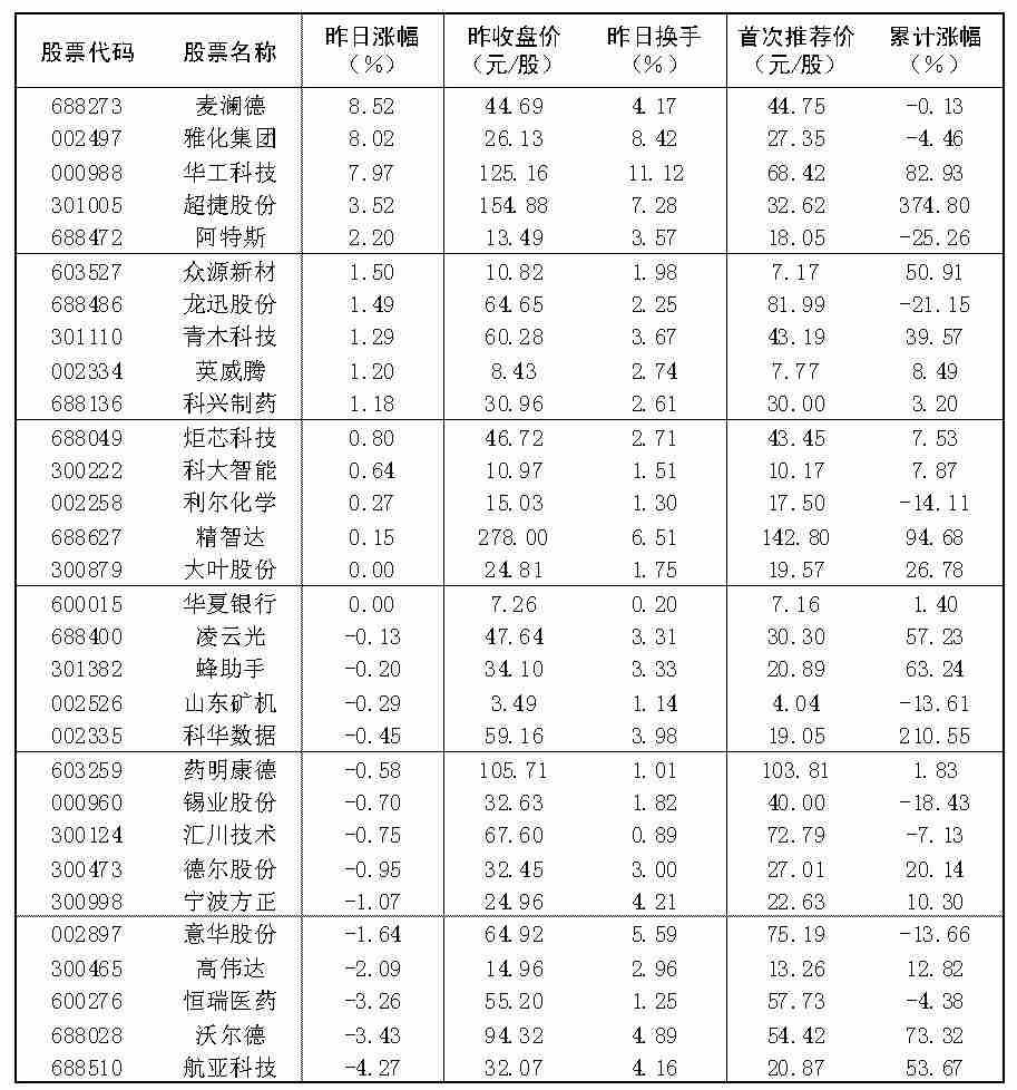 大众30指数成份股中,13日涨幅前五位的分别是麦澜德、雅化集团、华工科技、超捷股份、阿特斯,涨幅分别为8.52%、8.02%、7.97%、3.52%和2.20%;跌幅榜上,航亚科技、沃尔德、恒瑞医药、高伟达等跌幅居前。