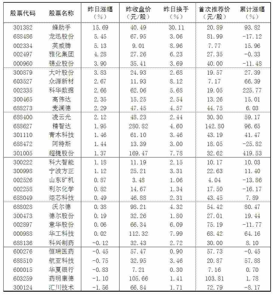 大众30指数成份股中,16日涨幅前五位的分别是蜂助手、龙迅股份、英威腾、雅化集团、锡业股份,涨幅分别为15.69%、5.45%、5.13%、4.28%、3.90%;跌幅榜上,汇川技术、药明康德、华夏银行、航亚科技等跌幅居前。
