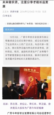需要注意的是,广西今年好成立时,《农资导报》(《中国化工报》主办)的官方微信公众号在2016年12月4日刊发文章《未来做农资,注重分享才能长远发展》,报道了广西今年好的揭牌成立仪式,并附有说明为“左起:苏日茂、吴信让、李红兵、李卫国、徐洪宽五大股东(原文如此)为广西今年好揭牌”的照片(见图三),文章还提及与会代表参观了田园生化的植保无人机装配车间,并附有公司现任高管唐进斌进行讲解的照片。