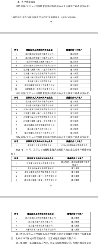 2025年上半年,建工资源又与控股股东控制的9家企业之间存在前十大客户重叠情况,重叠客户包括建工集团、北京城建集团有限责任公司。