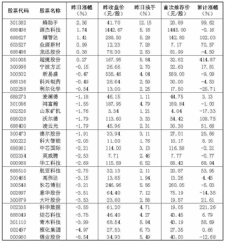 大众30指数成份股中,28日涨幅前五位的分别是蜂助手、源杰科技、精智达、众源新材、龙迅股份,涨幅分别为2.36%、1.74%、1.41%、0.99%、0.38%;跌幅榜上,锡业股份、雅化集团、青木科技、炬芯科技等跌幅居前。